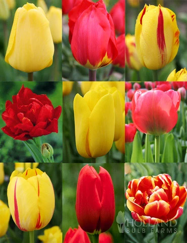 Enjoy classic spring beauty with yellow and red tulips blooming in perfect harmony all spring. The blooms will begin with the Jan Van Nes and Red Revival Single Early Tulips. To add some oomph to the garden the double early tulips Double Focus and Miranda will bloom at the same time as the single early tulips. Following up with the classic large blooms of Red Impression Darwin hybrid tulips & Golden Appeldoorn, which compliment the two tone Washington Tulips quite nicely! The final blooms will come from the tall, sturdy and stately La Courtine and Sky High Scarlet Single Late Tulips! Enjoy 100 blooms for over two months this spring!