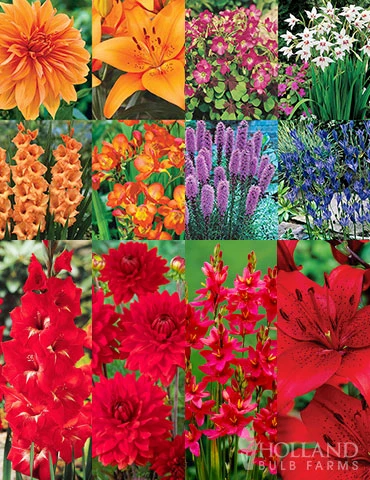 Warm and bright orange flowers from the Holland Pride Garden help create a welcoming garden scene. Holland Pride Garden includes dahlias, lilies, gladiolus and freesia.