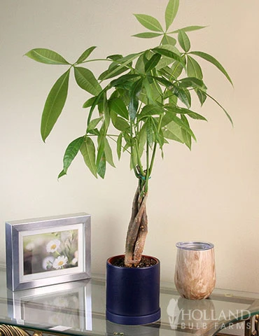 The Braided Money Tree is said to bring good luck and good fortune to your home! The interesting braided trunk is topped with glossy green leaves making this a beautiful addition to a bright room! This houseplant is very low maintenance and easy to grow! Water weekly or when the soil is dry to the touch and place in bright, indirect light. The Money Tree is slow growing but can reach up to 7′ tall over time!