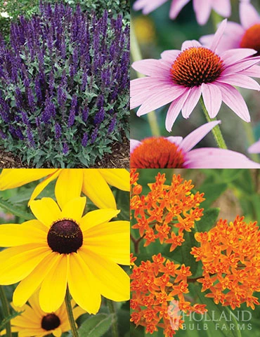 Butterflies will swarm to your garden with the Butterfly Bonanza Collection! This beautiful collection includes 4 types of perennials that will attract a wide array of butterflies to your landscape. Each collection includes Coneflowers, Rudbeckia, May Night Salvia and Orange Butterfly Weed. This colorful display will not only attract pollinators to your garden but is also fragrant and can be used in cut flower bouquets.