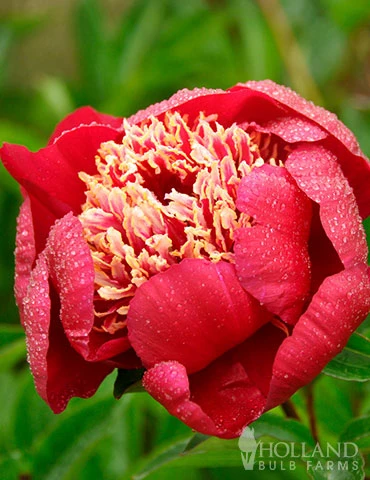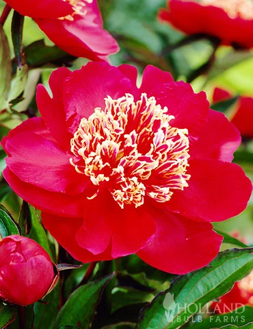 Showy cherry red blooms appear in late spring on the Charles Burgess Peony. This compact peony reaches it’s maximum height at 3′ tall with a similar spread. Velvety red blooms are highlighted by golden staminoides. The rich dark green foliage is attractive year round on Charles Burgess peony. Peonies are long lived garden plants, once established they require minimal care.