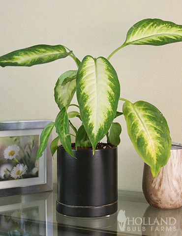 Dieffenbachia are one of the most popular and easy to grow houseplants available! Dieffenbachia Camilla offers a low maintenance option with beautiful green leaves with contrasting bright white surrounding the veins. Dieffenbachia do prefer bright light but can easily tolerate low to medium light environments as well. Help this tropical plant thrive by keeping watering consistent and provide a humid environment. This can be reached by misting the leaves consistently to mimic the tropical environment Dieffenbachia plants are native to.