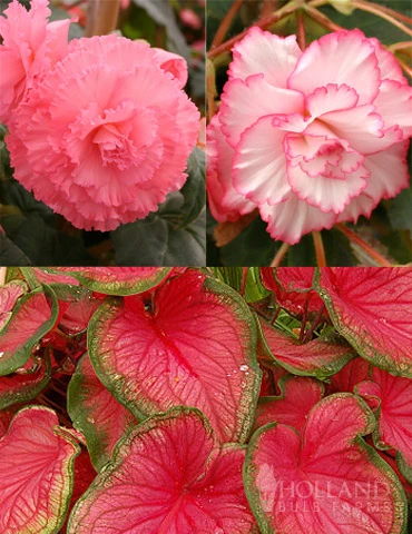 We can’t get enough of this Fancy Frills Pink Patio Collection containing some of our favorite caladiums and begonias! If you are looking for color in shade, this collection has color as well as texture for your shade garden and shaded patio planters! This combination can be planted together in one container, of 1 Pink Begonia, 1 Sweetheart Caladium and 1 White and Red Picotee Begonia, or can be spread out amongst your patio or front porch containers. Also makes for a great edge or border planting, plant the caladiums in the back, and use the blooms of the begonias as a foreground plant to bounce off the red color of the caladium leaves.