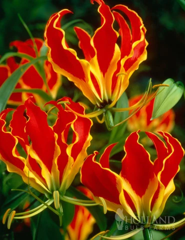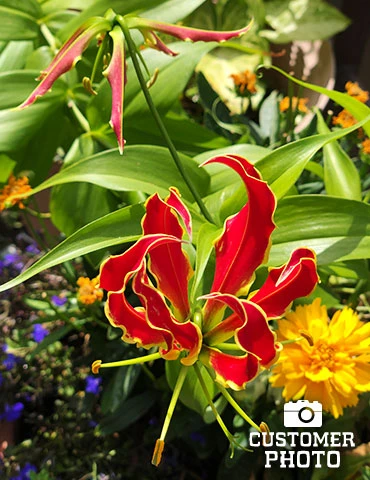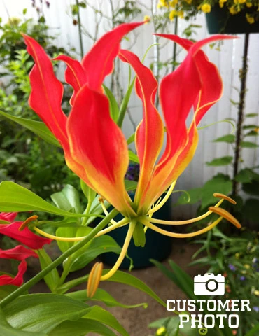 The Gloriosa Lily is a unique bulb that you are sure to want in your summer garden. This exotic flower will bring you home to the tropics with its vining habit and vibrantly-colored red and yellow wavy, swept-back petals. Grow in your favorite container or let it trail up your favorite arbor or along an architectural structure.