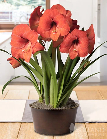 This potted bulb garden comes complete with a 8″ woven pot with plastic lining, soil, & bulbs, for immediate growing. 3 Gold Medal Amaryllis are planted in the bulb garden.