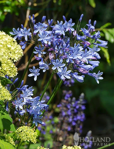 Clump forming perennial has grassy green leaves that are evergreen. Native to South Africa agapanthus is hardy in zones 8 and above. It can be grown in containers in colder zones, but will not be a perennial. Clusters of true blue flowers form in early summer.