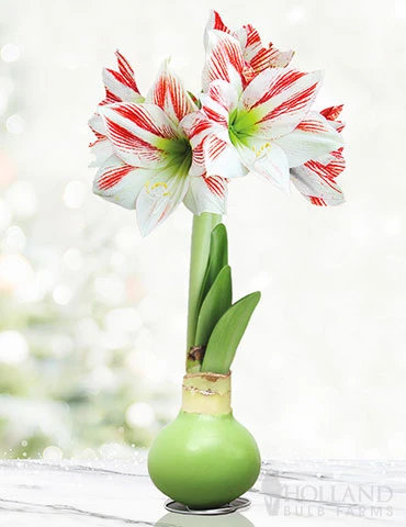 Are you looking for a unique gift for someone special this Holiday season? Look no further than our colorful Lollipop Waxed Amaryllis! The white and red striped Amaryllis bloom is a fun combination with the green dipped waxed Amaryllis bulb! The waxed Amaryllis do not require any water or soil to grow. Leave it in a bright location and watch it grow! A bloom will appear 4-8 weeks after arrival.