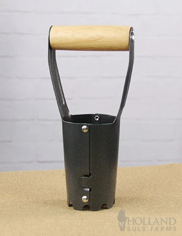 Planting bulbs is a breeze with the Premium Solid Handle Bulb Planter! This sturdy bulb planter is made of powder coated steel and has a heavy duty wood handle. Measurements can be found on the side of the planter to make sure holes dug to the proper depth. The Premium Bulb Planter also has a a serrated edge cutting through compact soil.