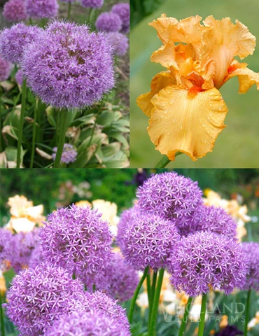 Plant in a clump or get a few of this collection for a beautiful mass border! Huge purple balls brightened up with the bright golden Iris will give a real ‘pop’ of light wherever you plant them.