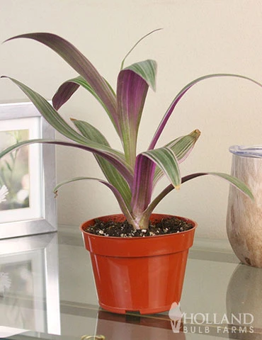 The Rhoeo Tricolor plant is easy to grow and adds color to any indoor space! The sword-like leaves have white and green variegation on the topside with a showy, purple on the underside. Also known as, Boat Lily, Moses-in-the-Cradle and Oyster Plant, this houseplant not only has beautiful foliage, it also yields small, white flowers Spring into Fall! Keep this plant away from direct light and keep the soil slightly moist, checking it daily to make sure it doesn’t dry out completely.
