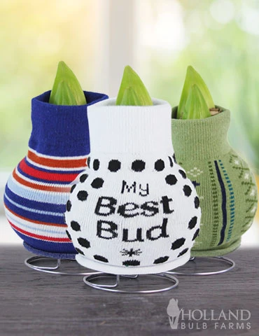 This is the perfect way to send Warm Wishes to someone you care about! A cozy green sweater amaryllis for comfort. A striped sweater amaryllis for warmth and well wishes. My best bud to show how much they mean to you. These easy to grow sweater amaryllis require no water to grow, they can also grow in low light settings, making them a versatile option for anyone who likes flowers.